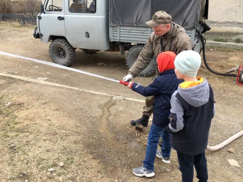 Встреча началась с урока, где юным жителям Кусы рассказали, как работают лесные пожарные и почему важно соблюдать правила поведения в походе и на прогулке. А затем все желающие могли и сами понять, как это – тушить огонь из рукава или ранца.