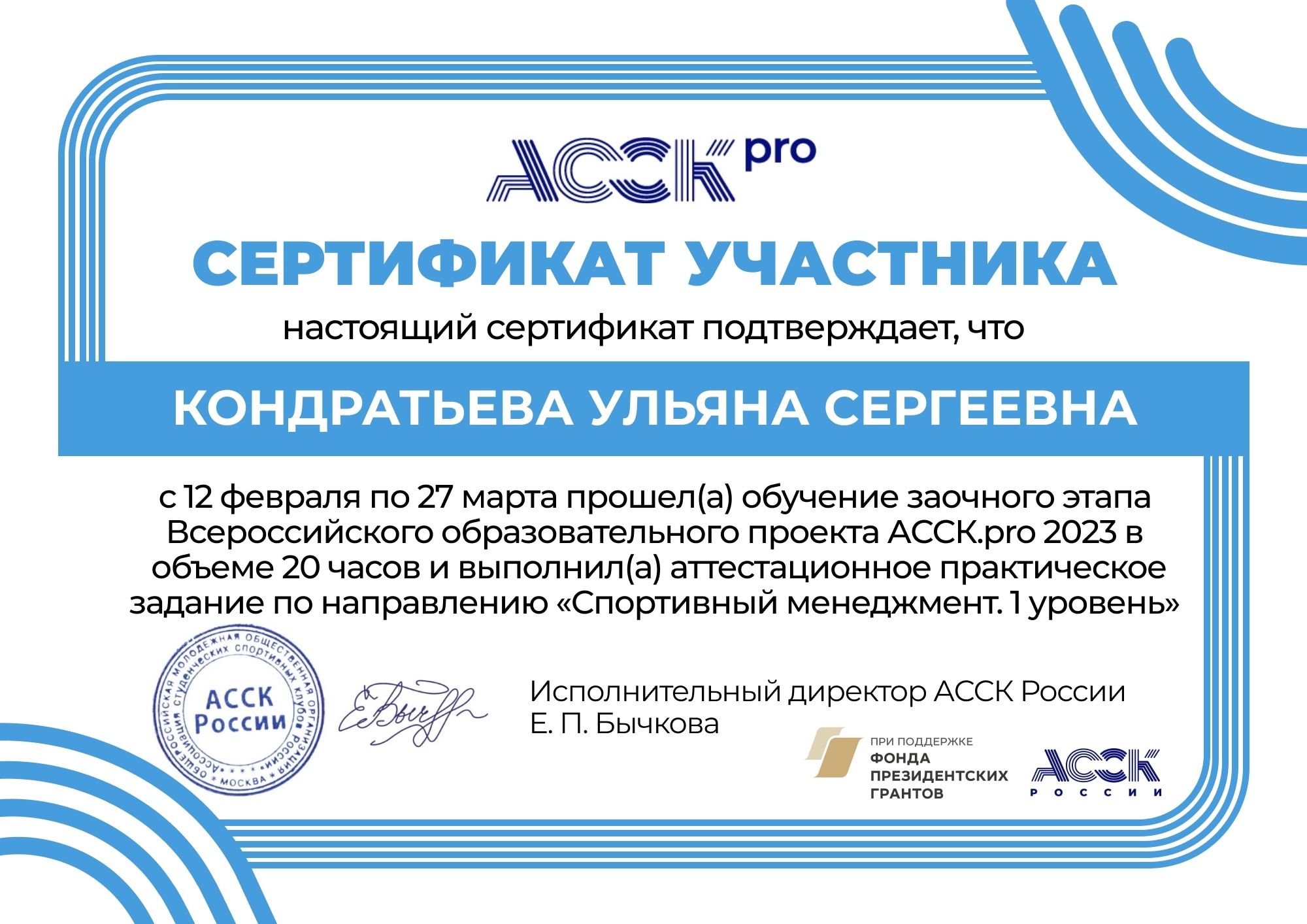 Работа с болельщиками — Дарья Зайцева Менеджер корпоративной культуры — Снежана Комиссарова Спортивный менеджмент — Ульяна Кондратьева Видеосъемка спортивных событий — Милена Новикова Сопредседатель ССК ЮУТУ «Хаски» — Даниил Халезин обучался на руководителя ССKПо итогам заочного этапа сопредседатель ССК «Хаски» — Ульяна Кондратьева набрала достаточное количество баллов и получила сертификат участника заочного этапа.
