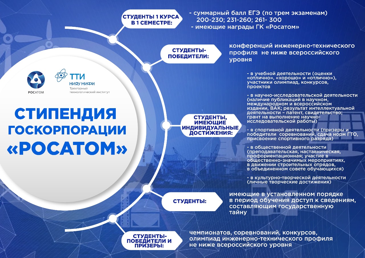Стипендия Госкорпорации «Росатом» направлена на продвижение бренда Госкорпорации «Росатом» среди обучающихся и абитуриентов, популяризацию инженерно-технических профессий, поддержку и поощрение лучших обучающихся и привлечение их на работу на предприятия Госкорпорации «Росатом».