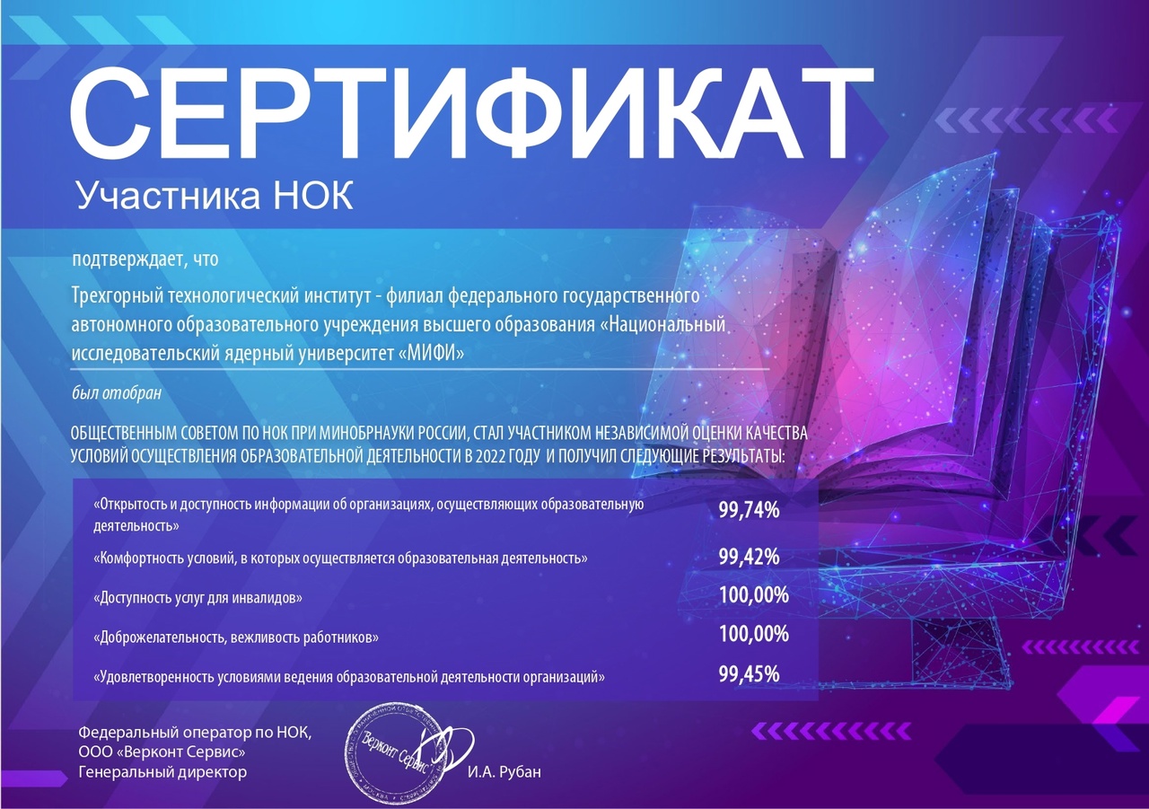 ТТИ НИЯУ МИФИ получил сертификат с высокими результатами по итогам независимой оценки квалификации (НОК) выпускников от Общественного совета при Минобрнауки России.