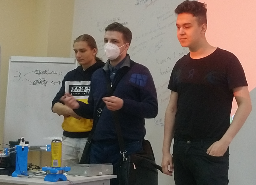 • вторая команда в составе Плешкова М. С., Яблоновского В.К. (ЕТ-212), Дудорова Д.М. (ЕТ-213), Пчелина А.В., Левченко Н.Е. (ЕТ-112) представила прототип устройства для определения внешних дефектов изделия, а также математическую модель обработки изображений изделия.
