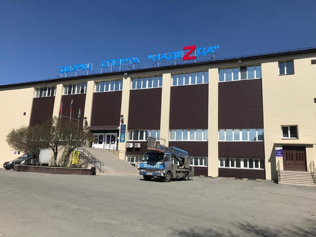 Буква Z появилась на здании дворца спорта «Надежда» в Челябинске. Z — символ поддержки российских военных в спецоперации и акции #СвоихНеБросаем .