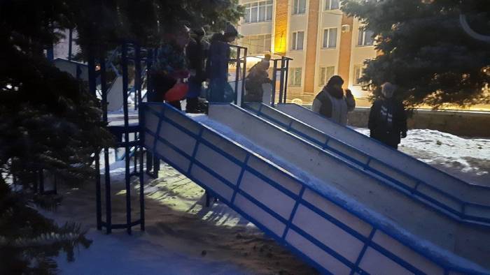 Эта горка – единственная в округе и всегда собирает множество детей. Рядом ней установлены опоры фонарей, но плафонов на них нет, а лампочки не горят. Единственным источником освещения служит подсветка здания администрации.