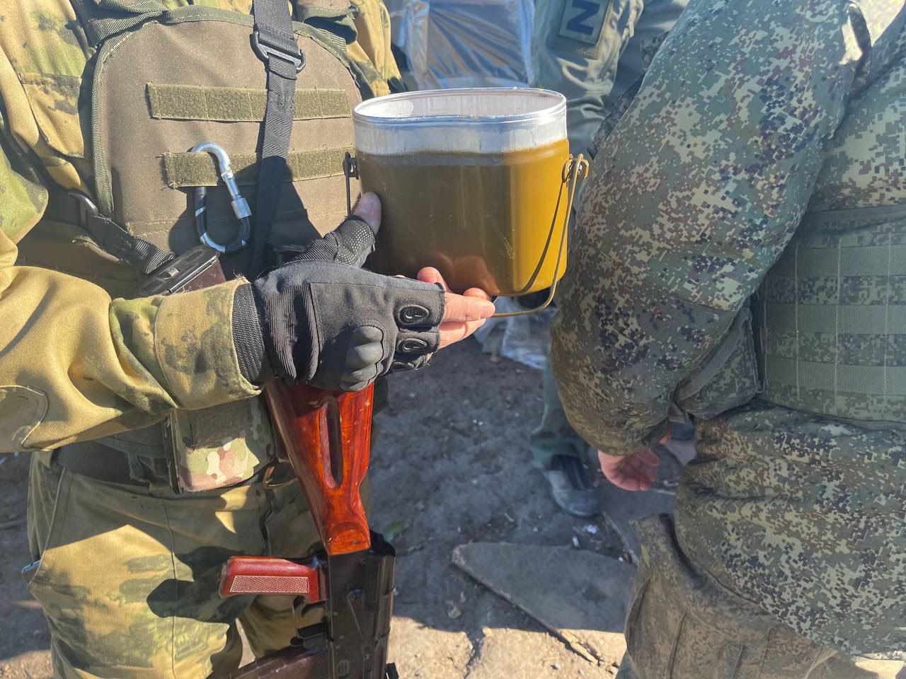 Готовый борщ разлили по солдатским термосам и доставили на позиции солдатам российской армии.