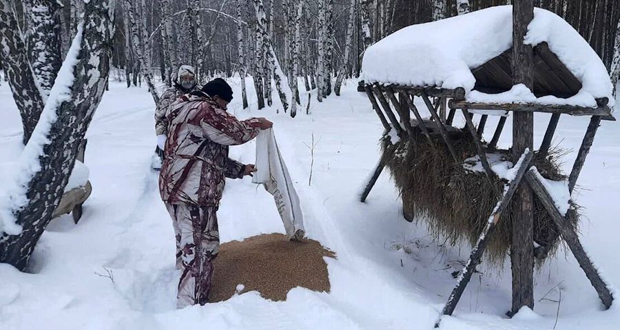 Весной выполняется вспашка восьми гектаров земли, ее засевают многолетними травами. Летом идет заготовка сена, а зимой охотники развозят его по кормушкам. На четырех егерских участках установлено 23 кормушки.