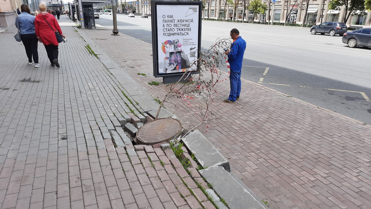 Не прошло и дня после появления жалобы главе Челябинска Наталье Котовой на проваливающийся люк в центре города, как опасный участок преобразился: в провал в плитке воткнули сухую ветку,