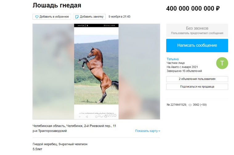 Объявление размещено на Avito. Примечательно, что продавец предпочитает сообщения вместо звонков. За гнедого жеребца продавец просит 400 миллиардов. В описании указано, что животное – 9-кратный чемпион.