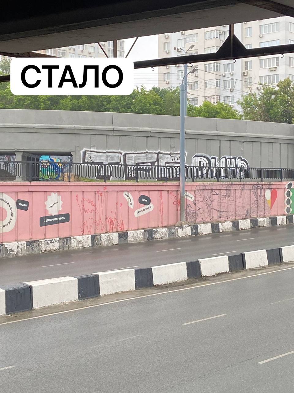 Как сообщает городской комитет дорожного хозяйства, данная стена была очищена и покрашена в минувшую субботу, второго июля. В порядок объект приводил подрядчик КДХ. К сожалению, обновленная стена продержалась лишь день - уже в ночь с третьего на четвертое июля ее разукрасили вандалы.