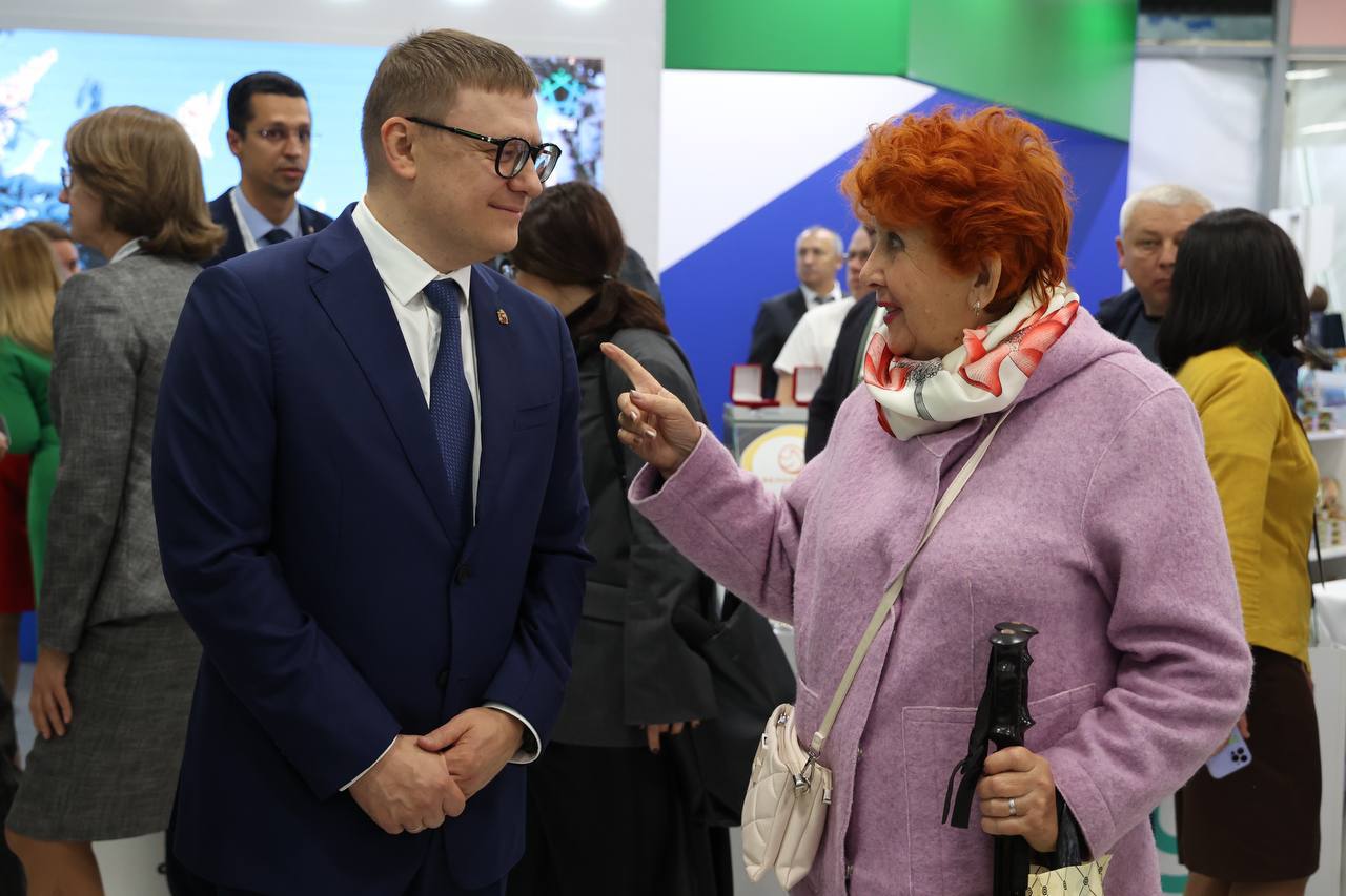 Алексей Текслер с посетительницей агропромышленной выставки в Челябинске. Фото Юлии Боровиковой (Вечерний Челябинск)