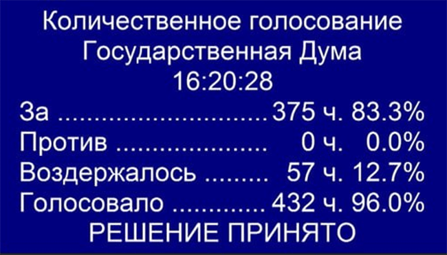 За его кандидатуру проголосовали 375 депутатов. Ранее Геннадий Зюганов сообщал, что фракция КПРФ воздержится при голосовании.