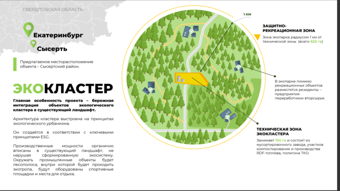 В информационном агентстве узнали о подробностях будущего проекта. Экокластер планируют построить между посёлками Никольское и Андреевка Сысертского района. Его опорным пунктом сделают село Щелкун, что в 15 км от крайнего населенного пункта Челябинской области — села Щербаковка Каслинского района. Представитель ООО «Экологические системы», того концессионера, о котором упомянули в Министерстве экологии Челябинской области, Алиса Кулагина показала проект будущего предприятия.