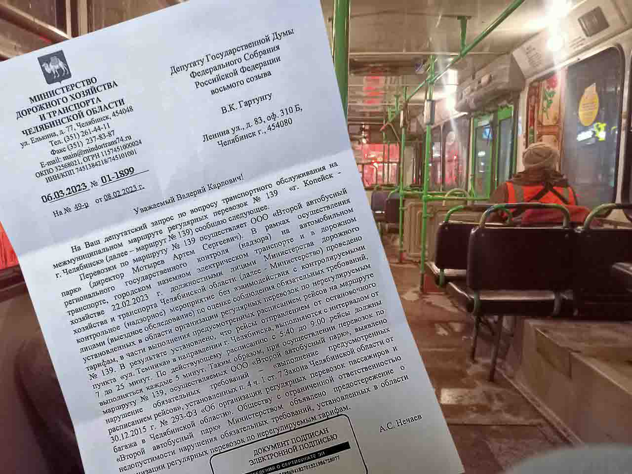 Чтобы помочь замерзающим на остановках землякам, Валерий Гартунг направил депутатский запрос в Министерство дорожного хозяйства и транспорта Челябинской области. Там отреагировали оперативно. Специальная комиссия выехала на место и провела проверку. Опоздания обнаружились сразу. По итогам инспекции ведомство вынесло перевозчику строгое предостережение.