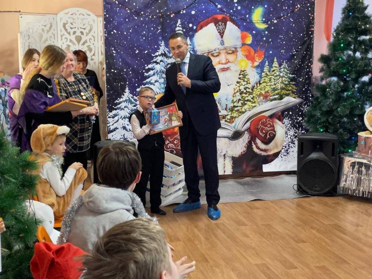 После новогоднего представления депутат вручил всем детям сладкие подарки.