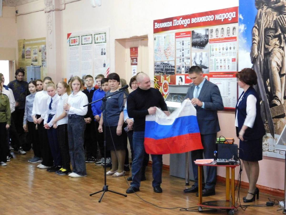 Школьникам из Южноуральска передали полотнище-триколор с автографами бойцов СВО