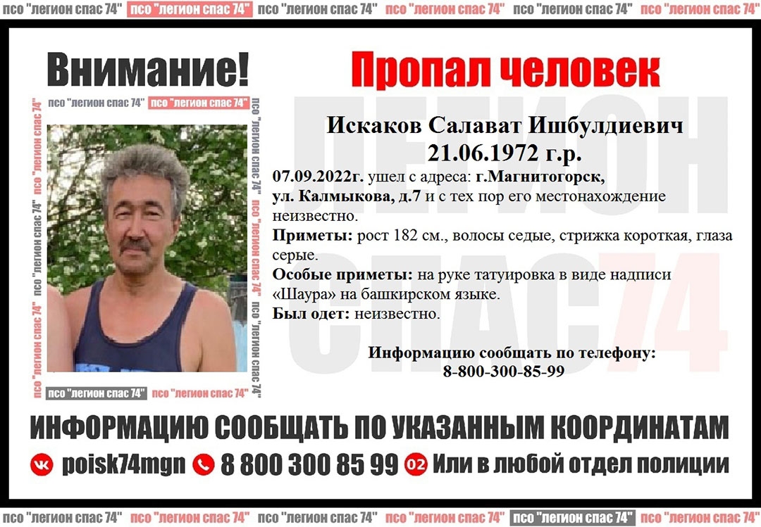 50-летний Салават Искаков 7 сентября ушел из дома № 7 на улице Калмыкова, с тех пор его местонахождение неизвестно.