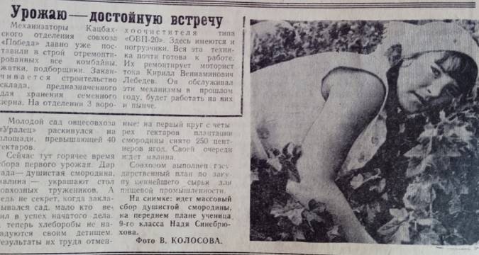 Речь в заметке шла о молодом саде совхоза «Уралец», где выращивались малина, смородина, наверное, и другие культуры. Размер сада впечатлял – 40 гектаров! И в сезон, когда урожай поспевал, взрослым помогали школьники. На фото была запечатлена ученица 9 класса местной школы Надя Синебрюхова.