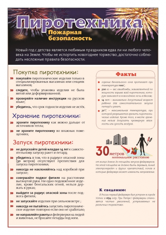 Запускать фейерверки II и III класса необходимо на ровной площадке без деревьев, линий электропередач и других препятствий, на безопасном расстоянии от жилых домов (не менее 30 метров), а также на безопасном расстоянии от массового скопления людей.