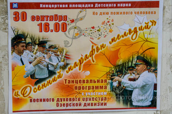 В пятницу в детском парке на концертной площадке состоялась танцевальная программа ко Дню пожилого человека «Осенний марафон мелодий». Для озерчан играл духовой оркестр штаба дивизии под управлением военного дирижёра майора Алексея Донского.