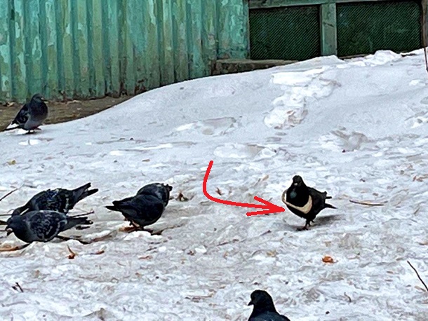 Один из наших читателей заметил среди голубей одного, на грудину которого оказалась надета хлебная корка.