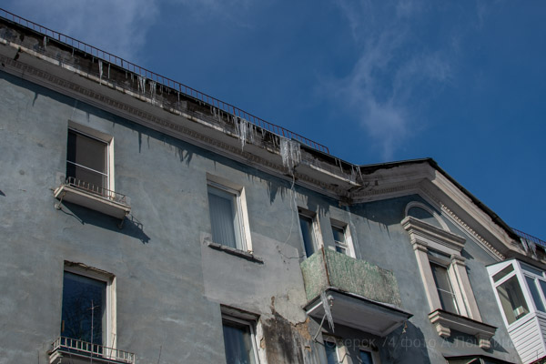 Попутно навестили «королеву» сосулек на улице Кирова. Кстати, обильное течение с крыши нехорошо и для самого здания, посмотрите, сверху на фасаде разрушается каменная кладка.