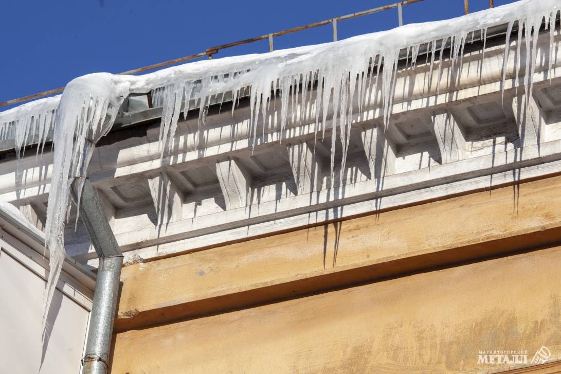 Пока в Магнитогорске борются с сугробами и накатами на дорогах, снег скопился на кровлях домов.