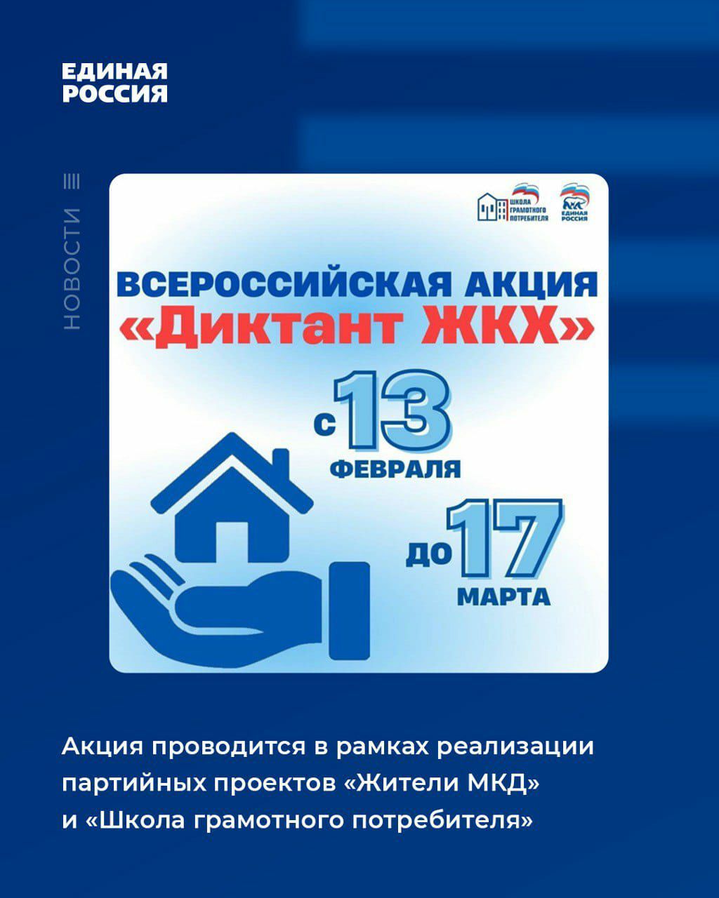 Единая Россия» объявляет о старте «Диктанта ЖКХ». Акция проводится в рамках реализации партийного проекта «Жители МКД» при поддержке федерального партийного проекта «Школа грамотного потребителя».