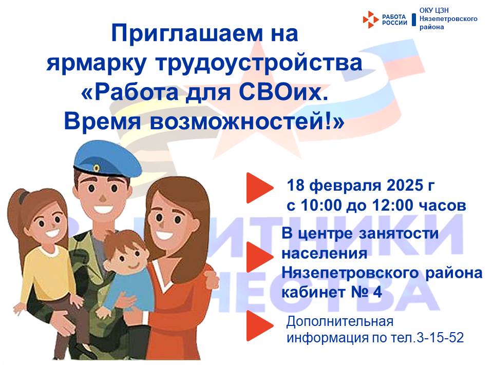 18 февраля 2025 г. в центре занятости населения Нязепетровского района состоится ярмарка трудоустройства «Работа для СВОих. Время возможностей» для участников специальной военной операции и членов их семей.