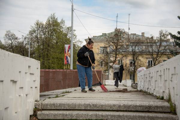 Руководит процессом начальник отдела молодёжной политики Управления культуры Юлия Кибальник: «Традиционно делаем уборку в преддверии Дня Победы. Дел много, надо убрать траву, всё вымести, помыть трибуну. За порядком на этой территории следим совместно с сотрудниками городского музея, которые сначала сгребли весь мусор, помыли памятник. Также в рамках Всероссийской акции наши волонтёры раздают жителям Георгиевские ленточки».