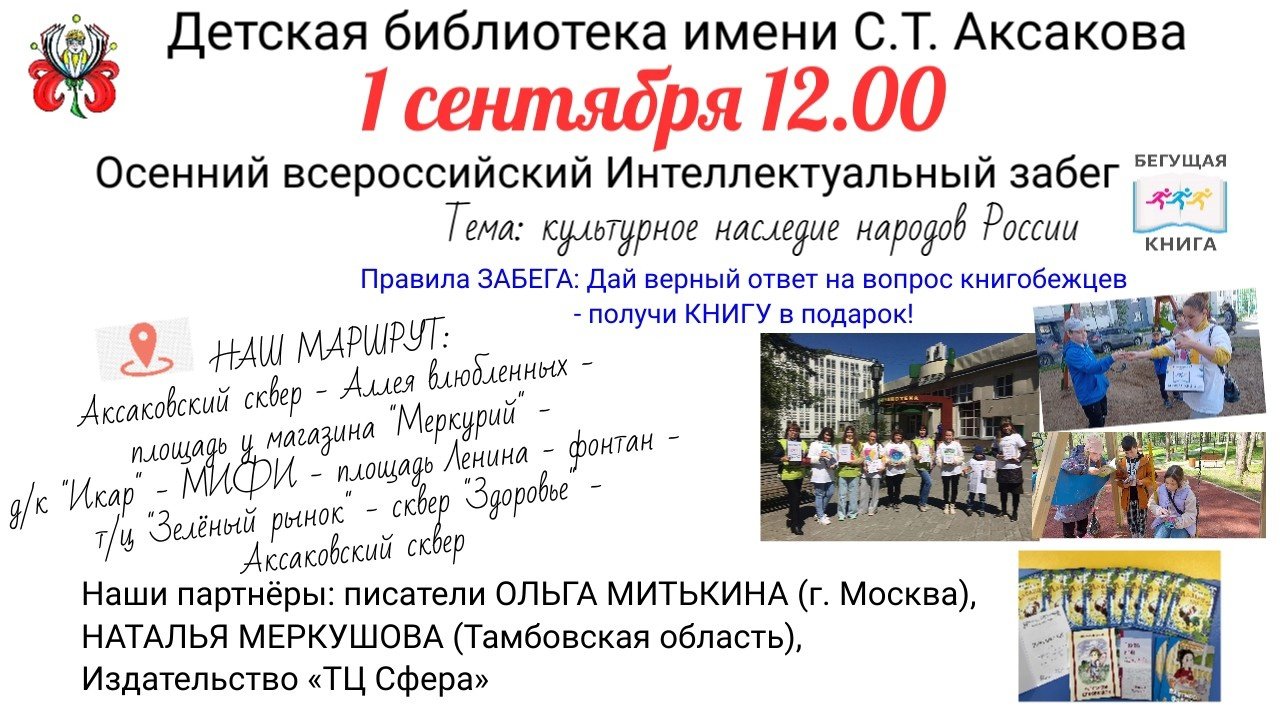 В этот раз тема акции – культурное наследие народов России. Готовьтесь, вопросы будут и по литературе разных народов, про их фольклор, традиции и обычаи. И, как принято, за правильный вопрос организаторы подарят книги. В этот раз партнерами забега стали писатели Ольга Митькина (г. Москва), Наталья Меркушова (Тамбовская область) и издательство «Т/Д Сфера»