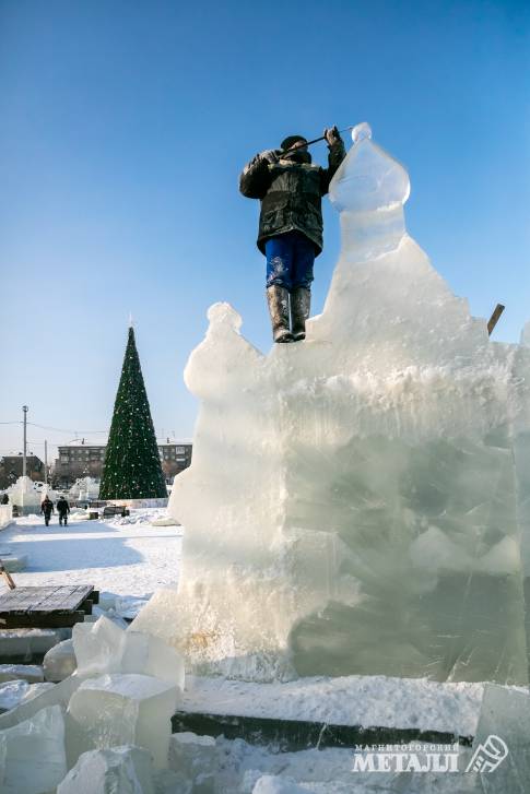 Вовсю кипит работа возле Курантов – практически готова входная группа, вырисовываются основные фигуры будущей композиции. Работа с ледовыми скульптурами требует определённых навыков, поэтому из года в год муниципальный заказ выполняют лучшие архитекторы города. Александр Мартимьянов занимается этим с 2002 года – руку набил, что уж говорить. Поэтому из-под его инструментов достаточно быстро вырисовываются орнаменты, части фигурок.