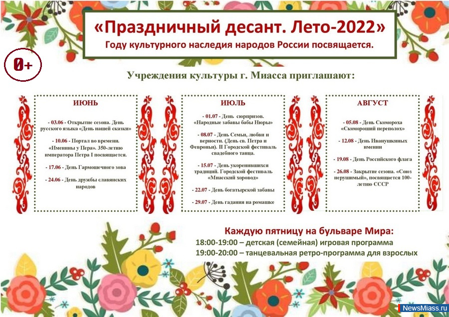 Программы "Праздничного десанта" будут радовать горожан на протяжении всего лета. Как отмечают в управлении культуры администрации Миасского городского округа, в этом году мероприятия будут посвящены Году культурного наследия народов России. Каждую пятницу с 18:00 до 19:00 - детская игровая программа (0+), с 19:00 до 20:00 - танцевальная ретро-программа для взрослых (0+). Впрочем, на обеих площадках привечают участников любого возраста.