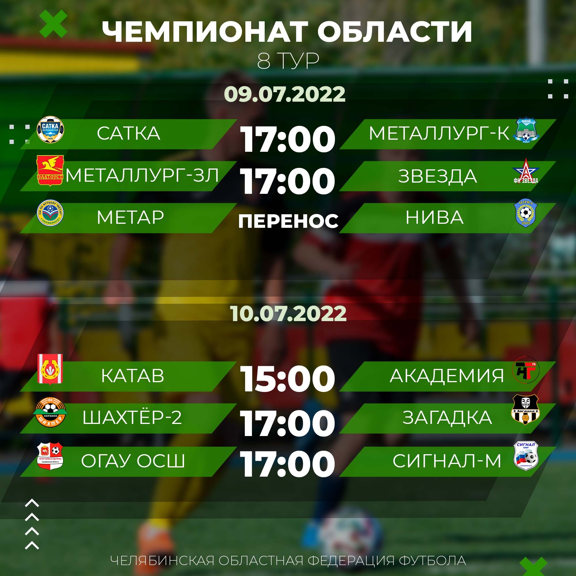 Расписание матчей 8 тура чемпионата Челябинской области по футболу среди любительских команд.