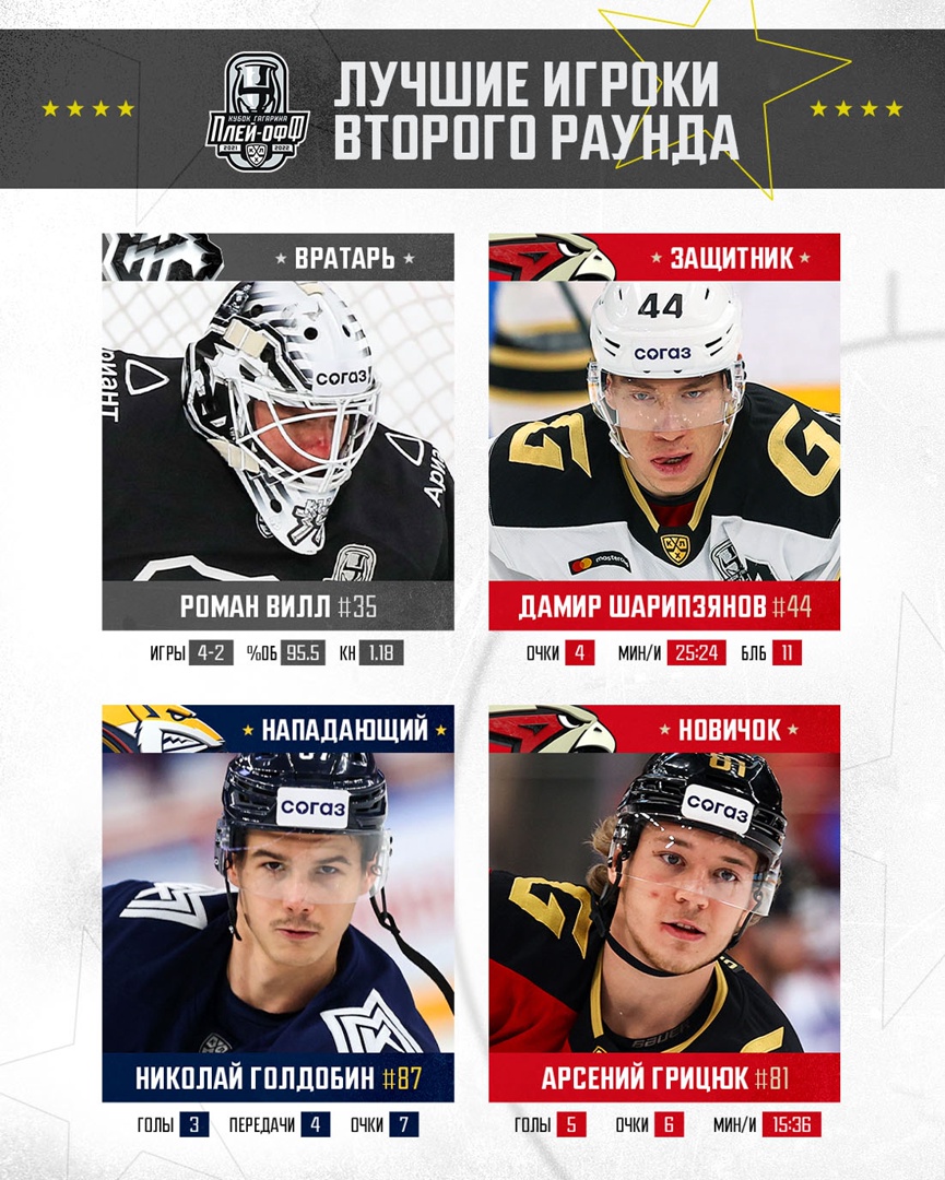 Комиссия по определению лучших хоккеистов Чемпионата Континентальной хоккейной лиги – Чемпионата России на основании статистических данных выступлений игроков, предоставленных отделом статистики Центрального информационного бюро КХЛ и аналитической оценки матчей, определила лауреатов второго раунда плей-офф в четырёх номинациях.