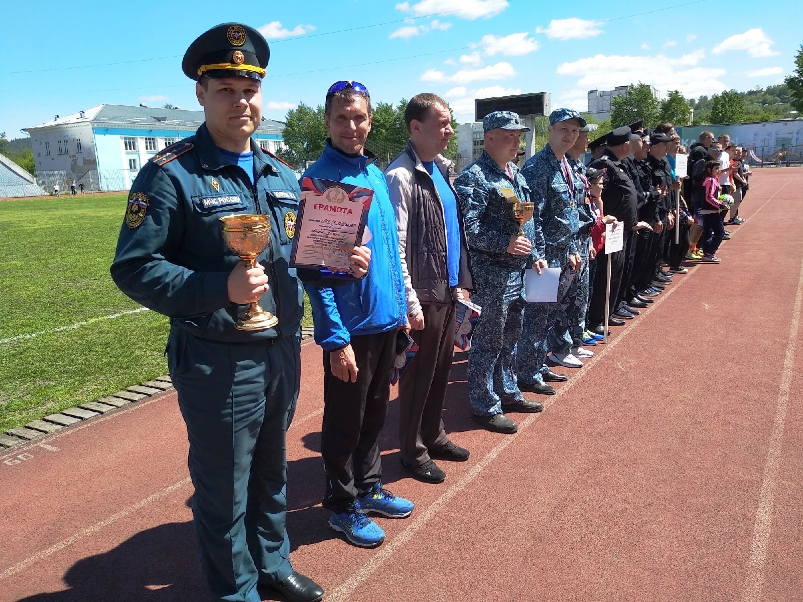 В это же время началась комбинированная эстафета. Бег с препятствиями, 300 метров — женский этап, бег в бронежилете, перетаскивание тяжелого ящика с «боеприпасами» и финиш — бег по стадиону 400 метров. Сотрудники МЧС одержали безоговорочную победу.