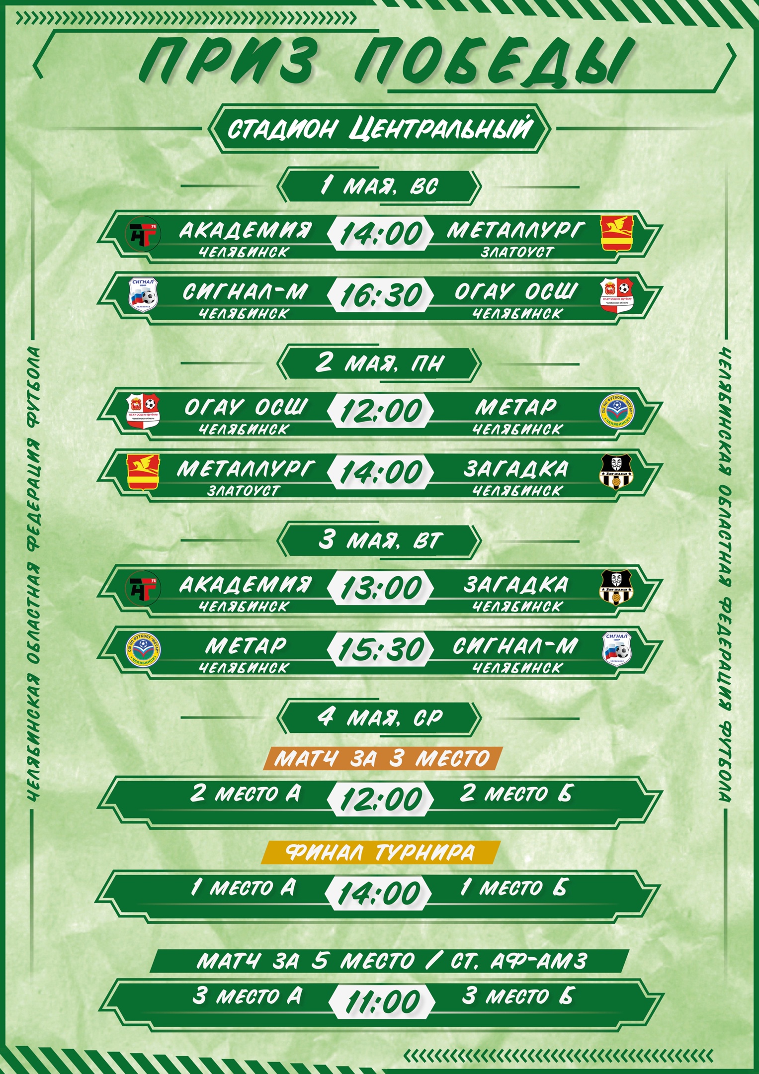 В традиционном турнире, посвященному Дню Победы, примет участие шесть команд областного чемпионата по футболу. Соревнования пройдут на стадионе «Центральный», за исключением стыкового матча за 5-6 место, который состоится на стадионе «Академия футбола-АМЗ».