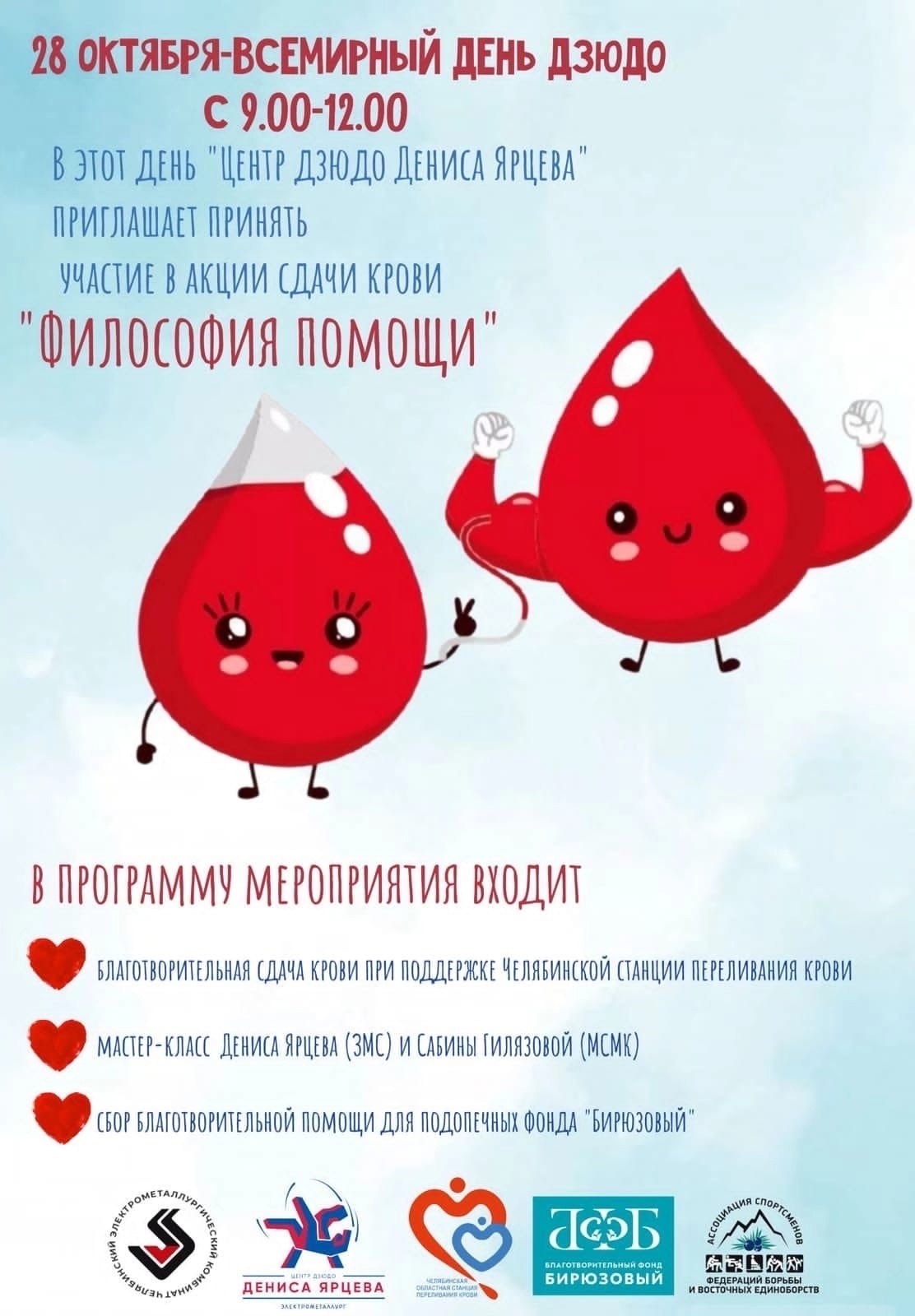 • донорская акция «Философия помощи» при поддержке Челябинской областной станции переливания крови, на которой дзюдоисты сдадут кровь и пополнят ряды участников донорского движения.
