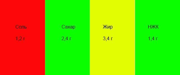 В каждой цветовой ячейке указывается количество содержания поваренной соли, свободных сахаров, жиров и трансжиров. Маркировка аналогична сигналам обычного дорожного светофора: красный обозначает опасность, желтый – внимание, зеленый – безопасность.