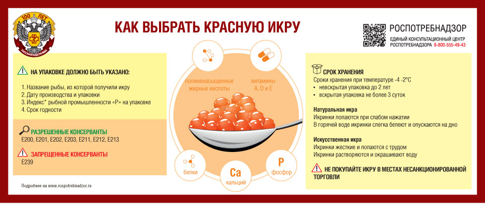 Как выбрать правильную икру? Не приобретайте красную икру с рук и в местах несанкционированной торговли. На этикетке должны быть указаны название рыбы, дата изготовления и дата фасовки. Маркировка на жестяной банке обязательно должна содержать дату изготовления продукта, слово «ИКРА», номер завода-изготовителя, номер смены, а также индекс рыбной промышленности «Р». Обратите внимание, что надпись должна быть «выбита» изнутри. Не приобретайте икру, в состав которой входит пищевая добавка Е-239 (уротропин). Ранее ее применяли как консервант, однако с 2008 года она была запрещена, так как при разложении в кислой среде желудка из уротропина выделяются ядовитые токсические вещества (формальдегиды). Разрешенными консервантами для икры остаются Е-200, Е-201, Е-202, Е-203, Е-211, Е-212, Е-213. Крышка банки не должна проминаться и не должна быть вздутой, икра должна заполнять баночку полностью. Икринки натурального продукта мелкие, однородные, рассыпчатые и цельные, не имеют пленок и трещинок. Если икра истекает соком, а икринки — «сдувшиеся», вероятно, икру уже размораживали. Натуральные икринки имеют ядро, искусственные же икринки однородны. Натуральные икринки лопаются при слабом нажатии, оболочка искусственных икринок более жесткая, сложно лопающаяся. Если положить икру в горячую воду, натуральная икра немного побелеет и опустится на дно, а искусственная растворится, окрасив воду. Как хранить?Хранить икру необходимо в холодильнике при температуре указанной производителем на упаковке товара. В открытой жестяной банке икру лучше не хранить, лучше переложите ее в чистую сухую стеклянную емкость.