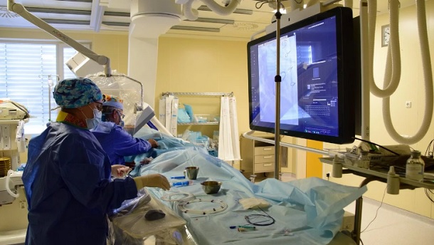 В структуре Центра есть два отделения. Первое — кардиологическое. Второе — отделение рентгенхирургических методов лечения и диагностики. Интересно, что операции там проводятся без разрезов и даже без общего наркоза: через небольшой прокол хирург сначала проникает в лучевую артерию, а потом в другой необходимый ему сосуд. Происходит это с помощью очень миниатюрных и тонких инструментов, а весь процесс отображается на экранах мониторов в реальном времени. Такой малоинвазивный подход позволяет исключить постпункционные осложнения, такие, как кровотечения.