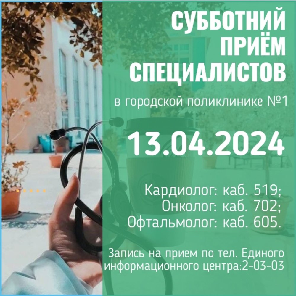 Сообщаем вам о проведении субботнего приема врачей-специалистов в городской поликлинике №1 (ул. Октябрьская, 17).
