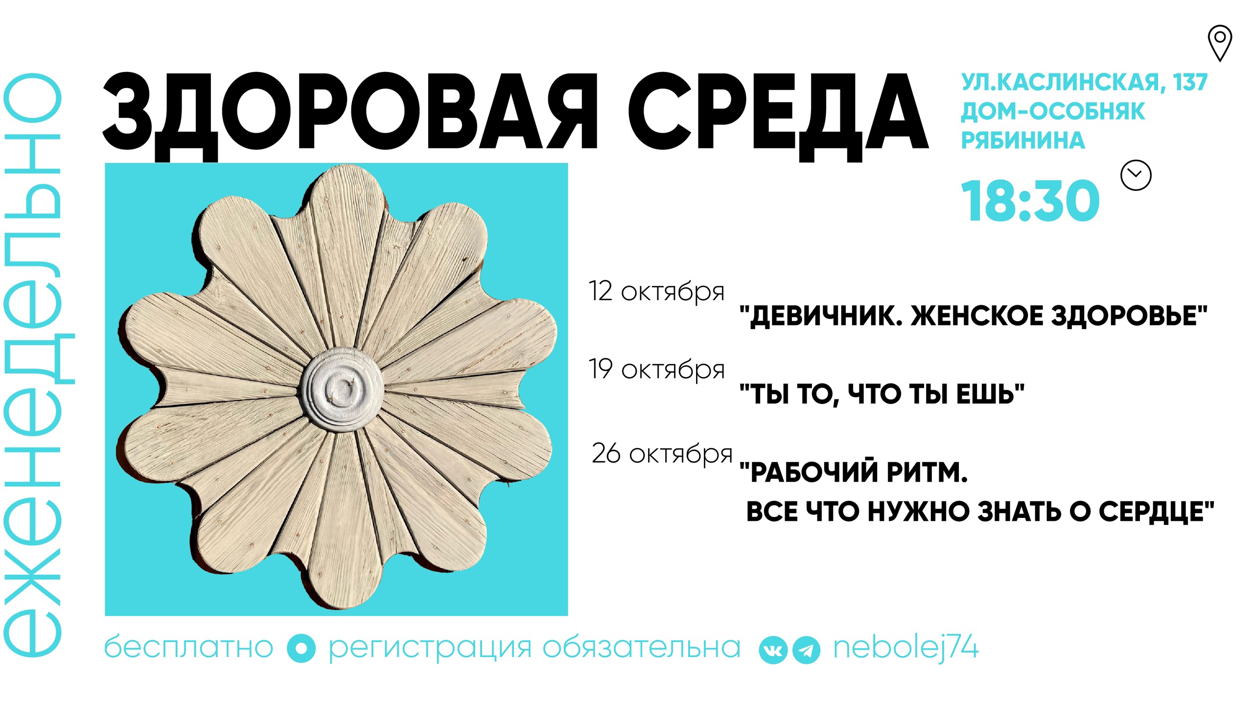 12 октября – «Девичник. Женское здоровье» 19 октября – «Ты то, что ты ешь» 26 октября – «Рабочий ритм. Все что нужно знать о сердце»«Современная жизнь и её высокие темпы развития предъявляют нам всё новые требования к здоровью. Нам нужно беречь себя и быть здоровыми как физически, так и психологически, чтобы противостоять стрессу, который уже настолько плотно присутствует в нашей жизни, что стал повседневностью. А выручит нас в этом здоровый образ жизни! Приглашаем на наши лекции, где будем говорить о том, как создать здоровую среду,» – рассказывает заведующая Центром общественного здоровья и медицинской профилактики города Челябинска Кристина Дубова .