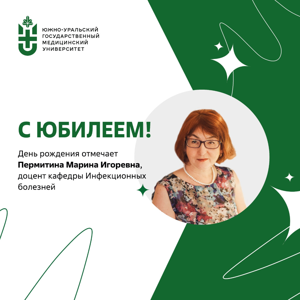 Коллектив кафедры инфекционных болезней и сотрудники клинических баз кафедры (МАУЗ ОЗП КГБ №8 г.Челябинска, областной инфекционный центр ОКБ №3) поздравляют Марину Игоревну Пермитину с юбилеем!